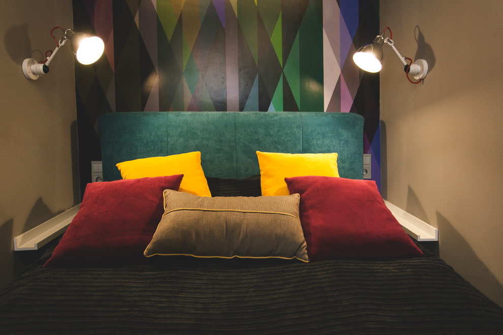 There was not enough space for the bedside tables - they are replaced by shelves for books and trifles. The sleeping area is illuminated by two wall lamps, and on the sides of the soft headboard there are sockets for charging a mobile phone.