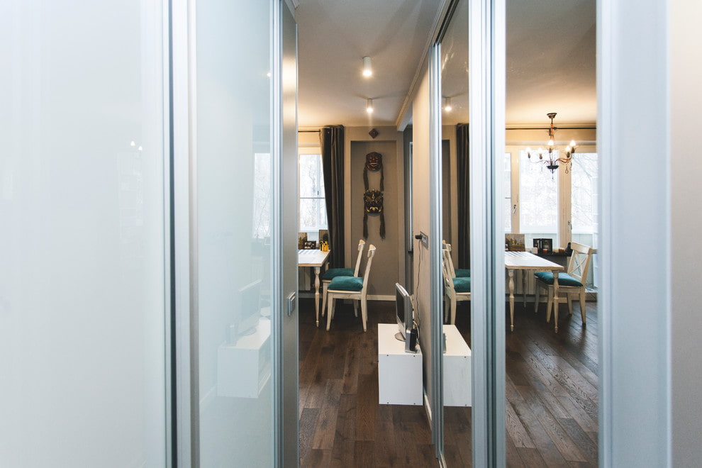 After demolishing the wall between the living room and the hallway, the designer designed a zoning structure: a wardrobe was built into it from the side of the corridor, and another wardrobe with sliding doors was located along the wall adjacent to the bathroom. Mirrored sheets help to optically expand a narrow space.