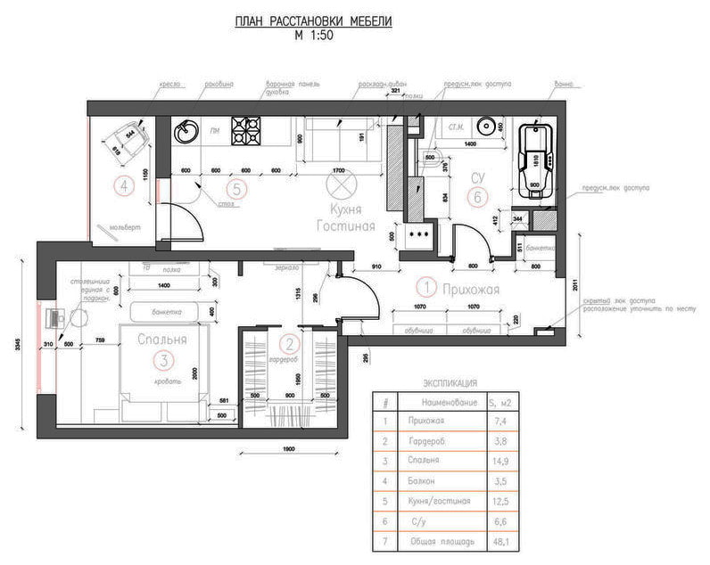 Since the area of the apartment is small, it was decided to make furniture for it according to the sketches of designers in order to save space. Only a few items were purchased in stores: some at IKEA, some at BoConcept.