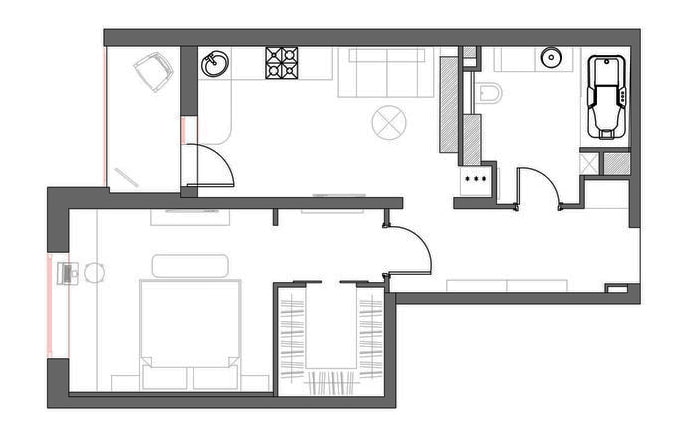 The redevelopment was not foreseen by the project, but the main requirement of the customer - the creation of an elegant living room combined with the kitchen - was fulfilled by the designers, despite the fact that they had to work on a small area.