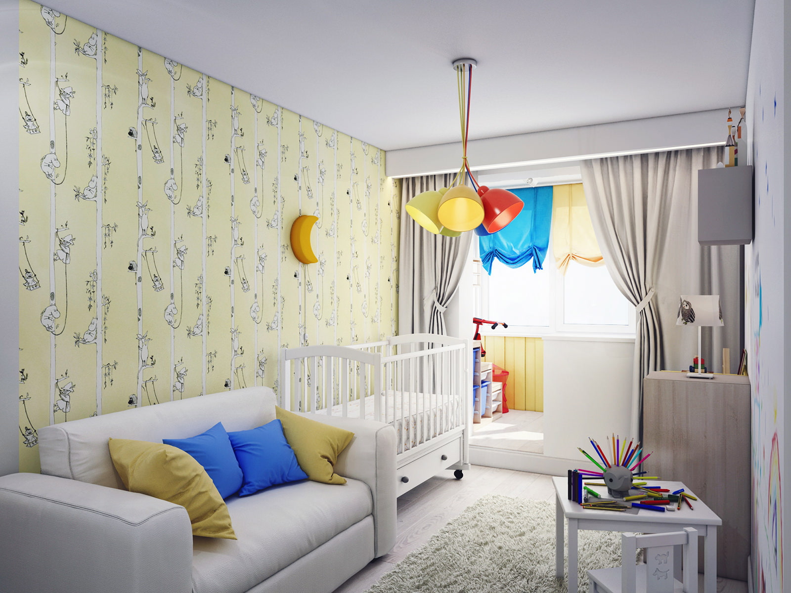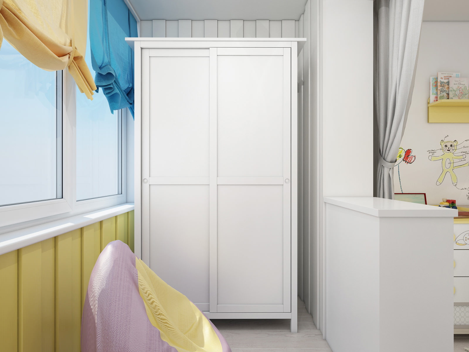 The children's room is extended due to the insulated loggia and is distinguished by an abundance of light, bright colors and functionality.