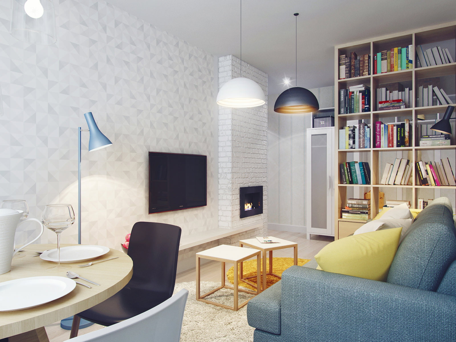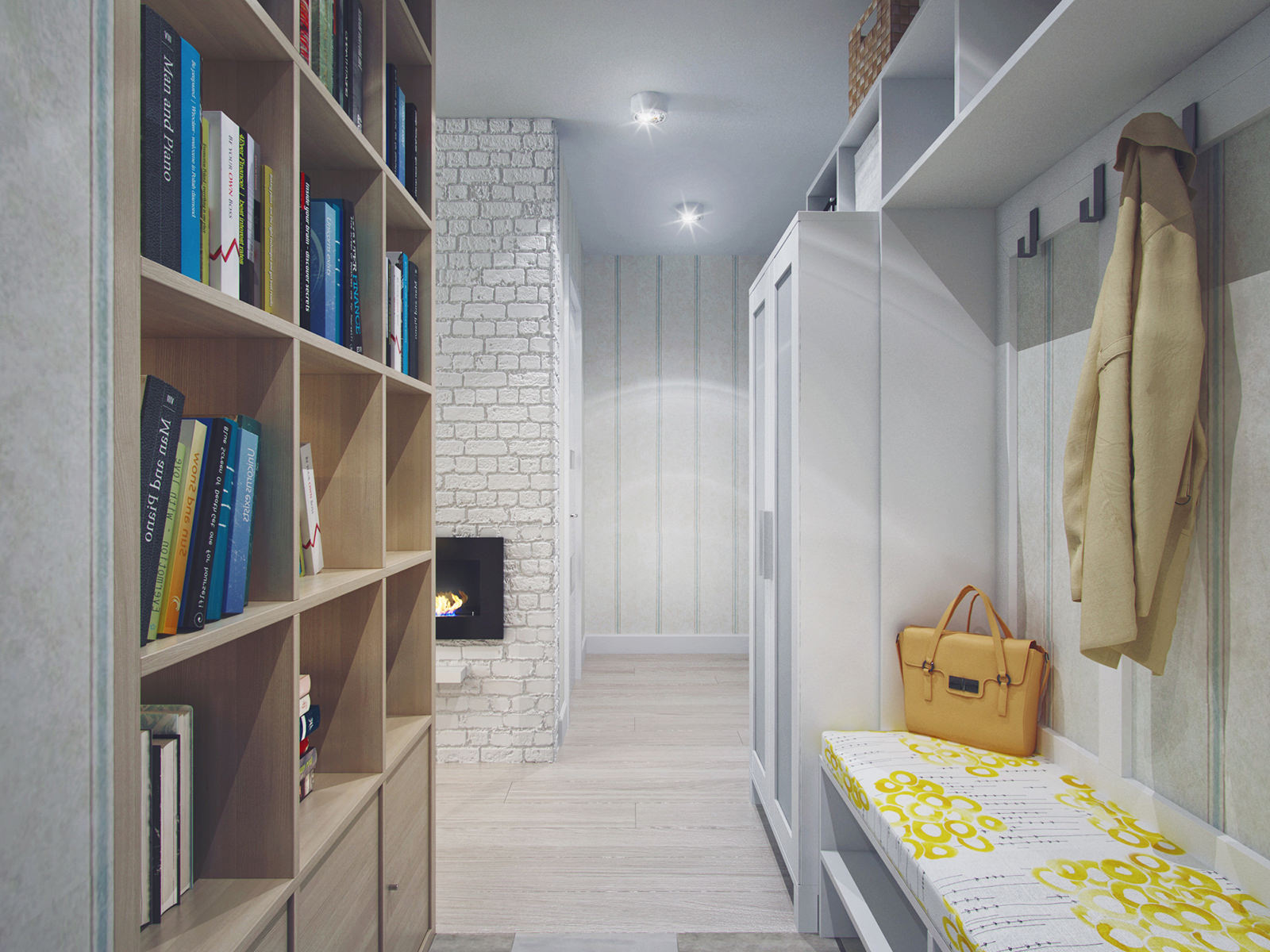 A shelving unit with wood texture, installed in place of the dismantled partition, separates the hallway from the cozy living room with a fireplace. The furnishings include a soft gray sofa and a cube-shaped coffee table.