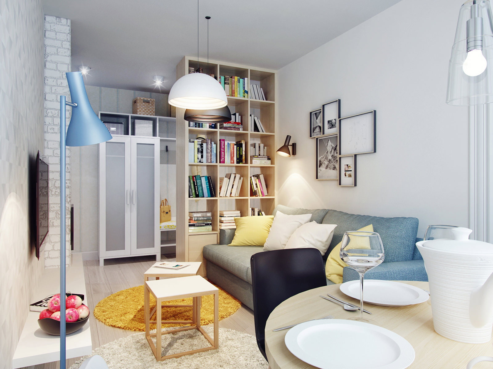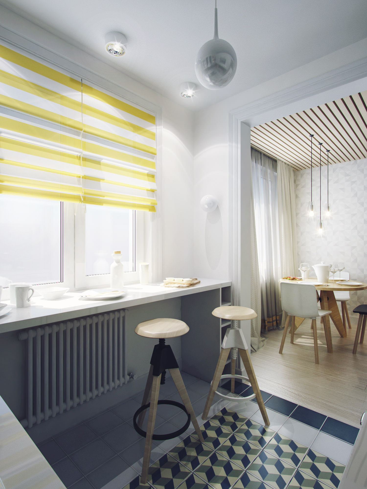 A floor lamp and pendant lamps with volumetric domes are used for evening lighting. Decorating the ceiling with wooden slats and lamps above the table emphasize the conditional zoning of the room into the living room and dining area.