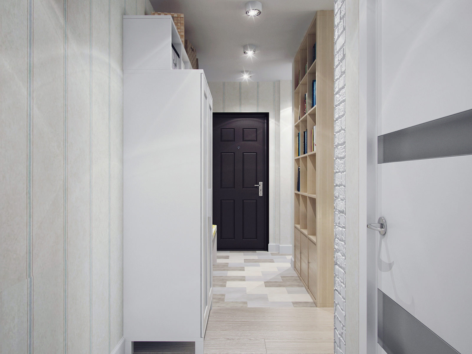 In the hallway extended in length, a set of furniture with shelves and a wardrobe is installed, where you can conveniently place outerwear, hats and shoes.