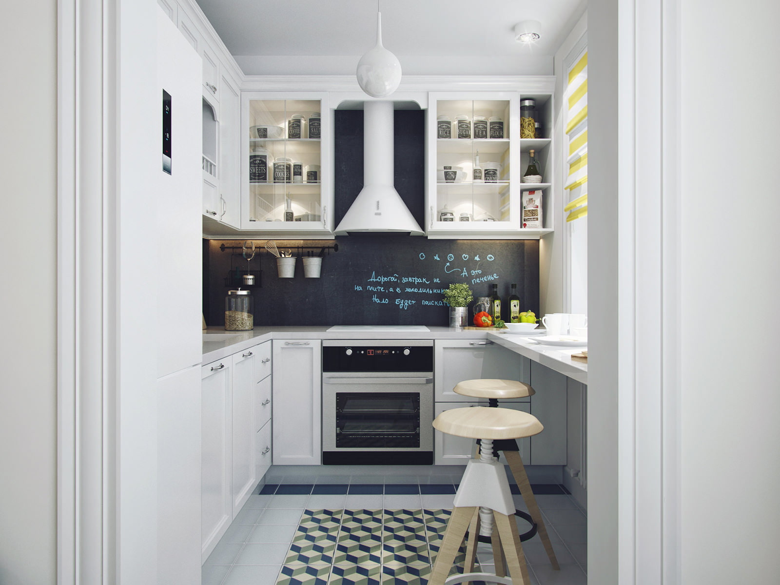 The kitchen contains not only a work area, but also a breakfast area, arranged on an extended windowsill. The classic corner set is made in light gray and impresses with its exquisite paneled facades and the impressive design of the upper row. The mosaic floor with an original pattern successfully complements the interior, and the cover of the apron under the blackboard allows you to write in chalk.
