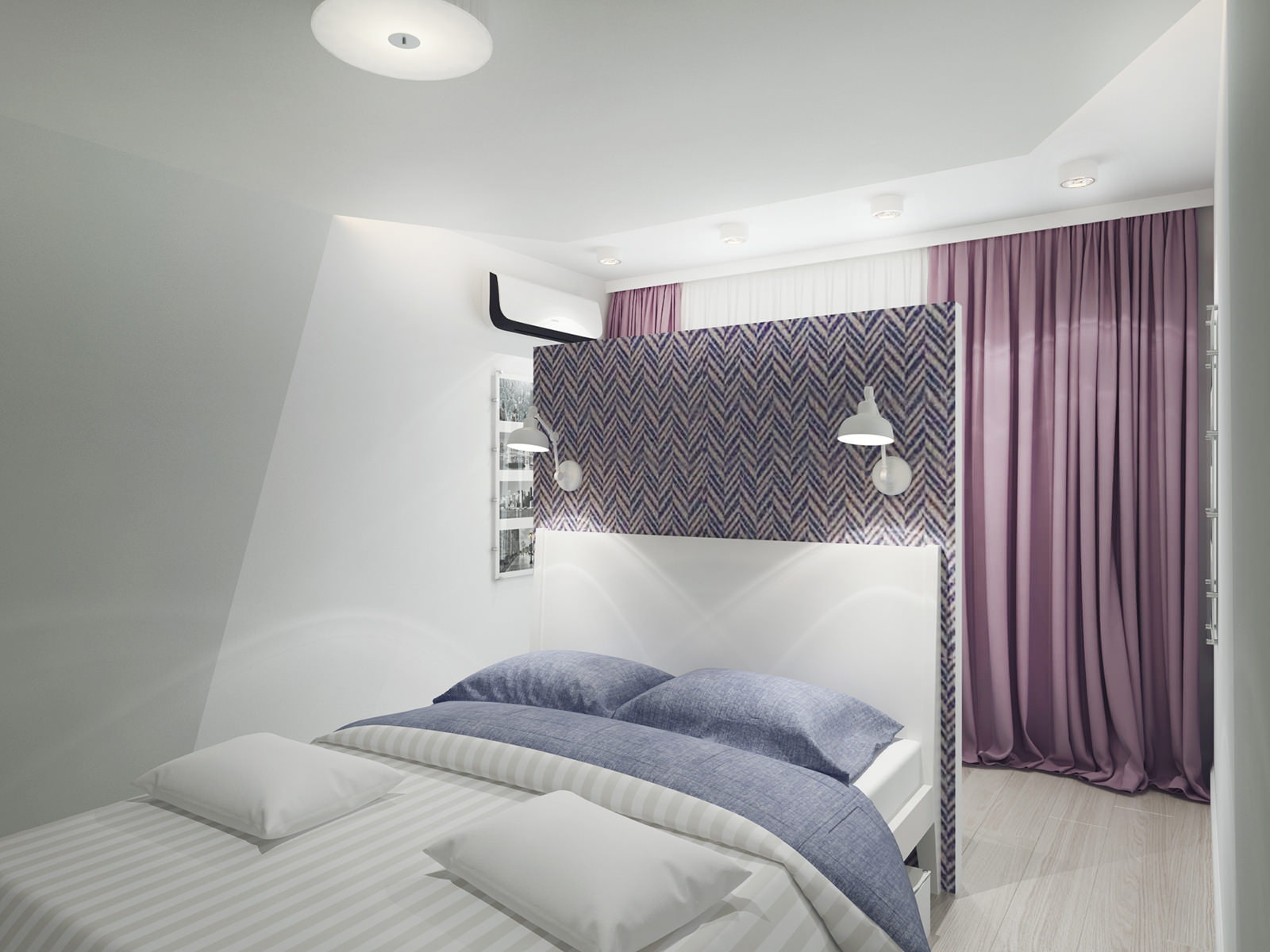 Decorating the room in light pastel colors and original ceiling lighting gave the room a romantic look. The furnishings include a double bed with a high headboard, TV panel, local lighting fixtures.