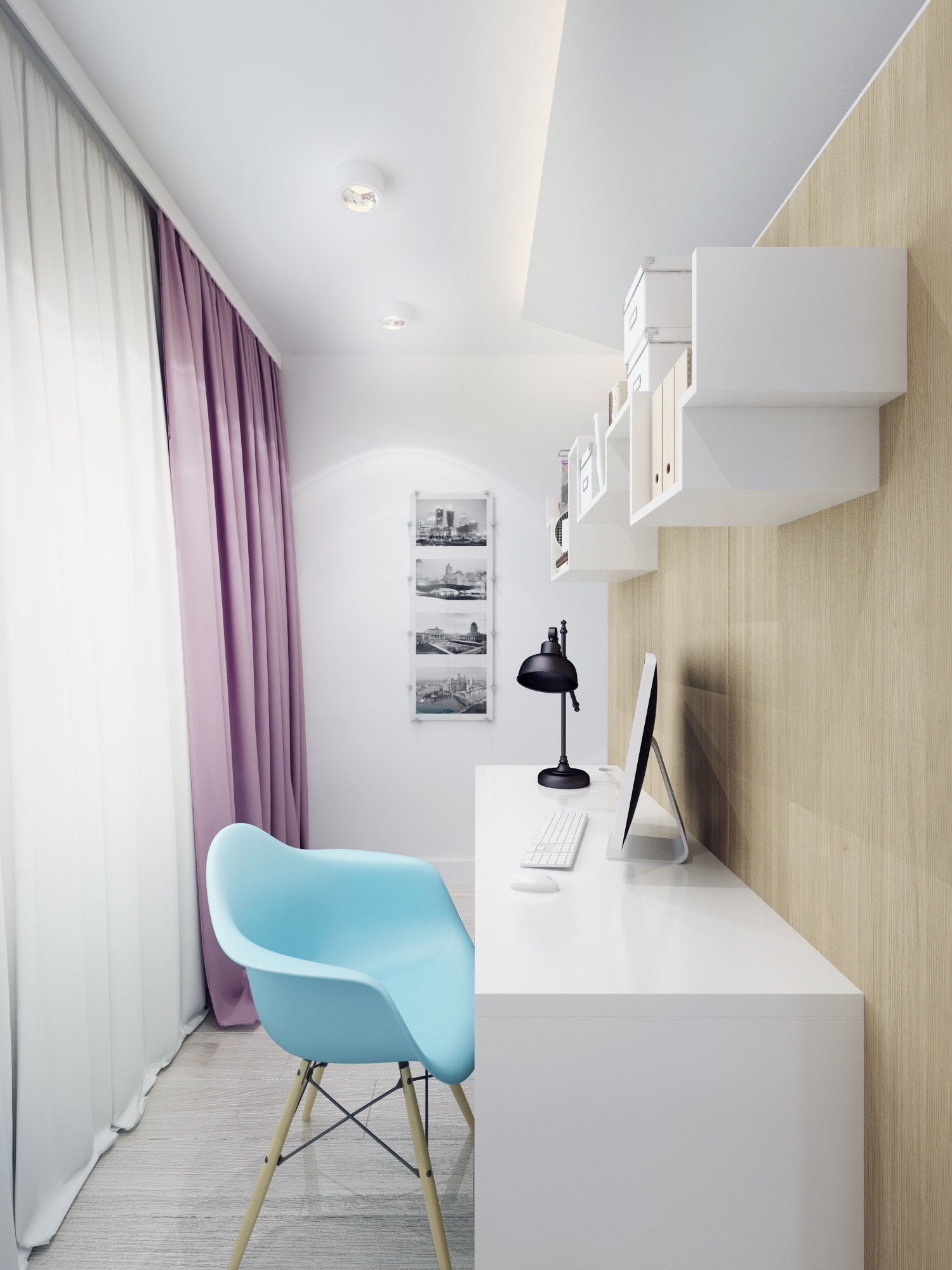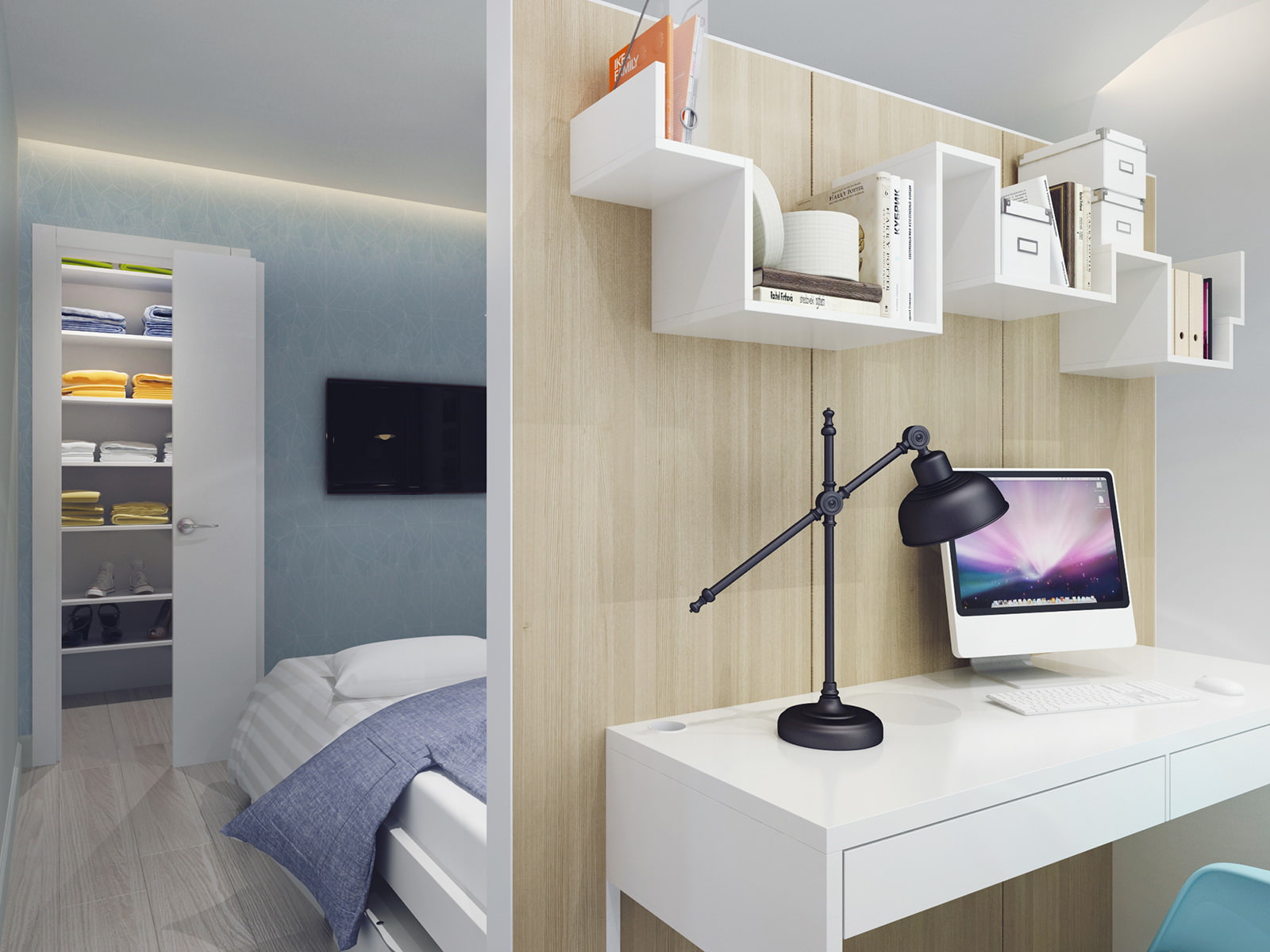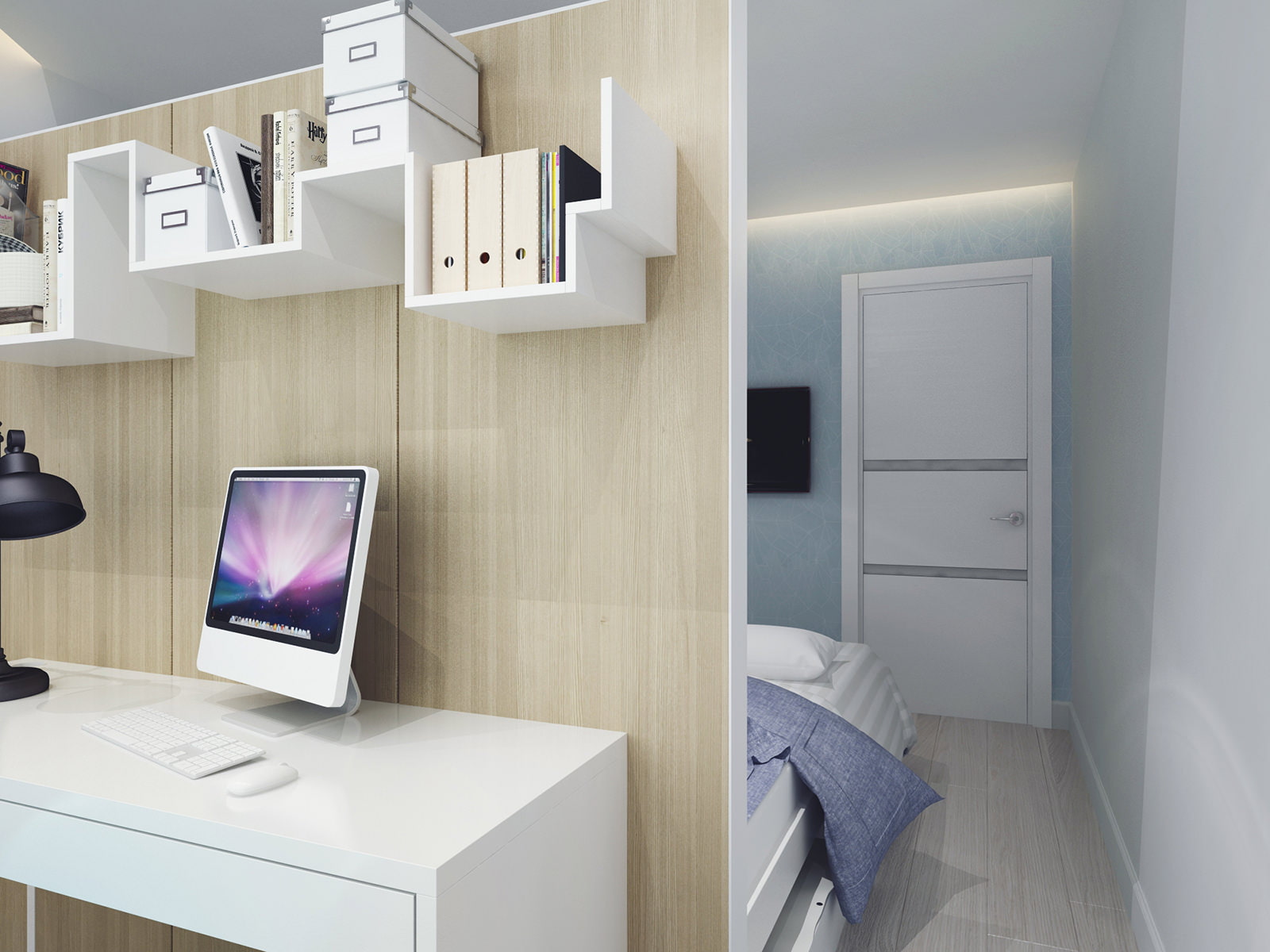 A design feature of a three-room apartment of 60 sq. m. - zoning of the bedroom with a partition in order to create a small office with a workplace.