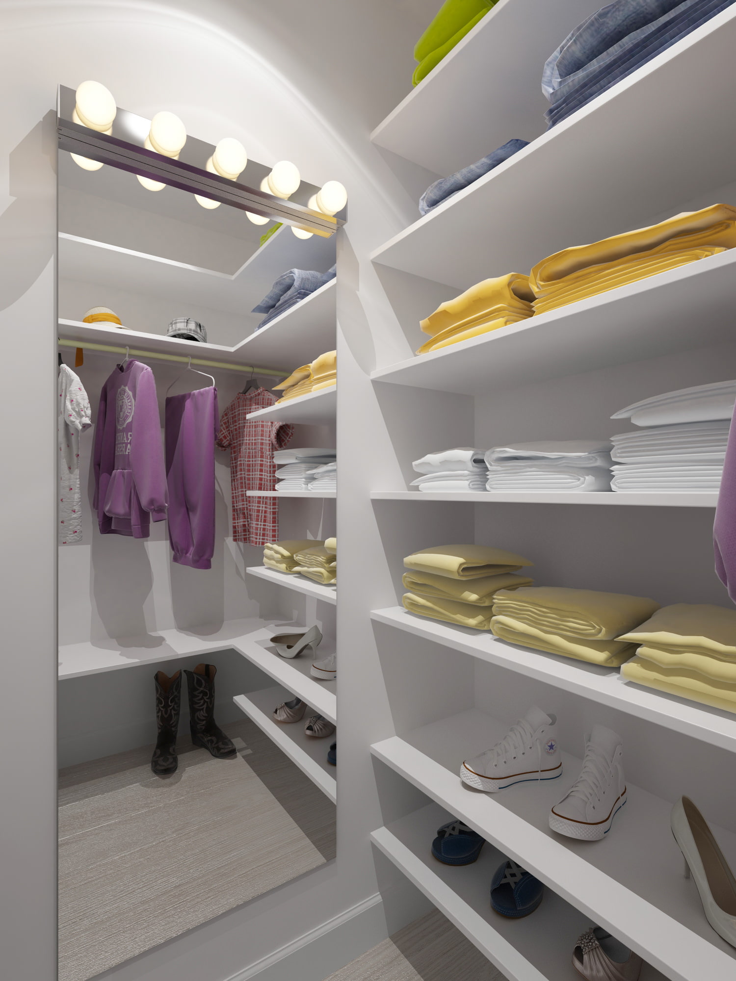 A wardrobe room with a folding door does not take up much space, but it is a practical place to store clothes, shoes, bedding. Mirror and lighting enhance the usability of the room.