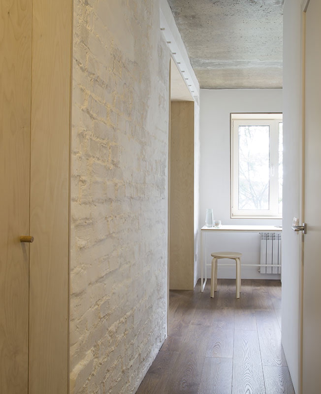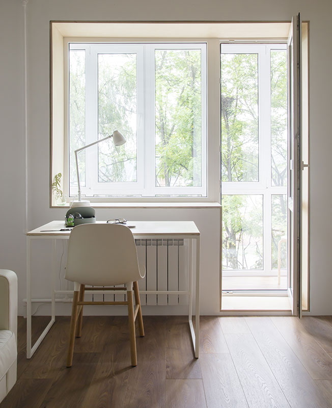 The whole atmosphere gives the impression of lightness, airiness, but at the same time austerity and brevity. Natural materials are used in the decoration - birch plywood, oak parquet, paint and plaster.