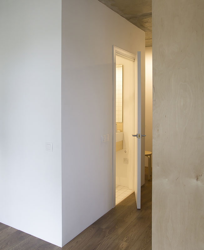 The plywood cube is custom made: it forms a double bed, a wardrobe and hidden storage boxes. The seating area is represented by a soft sofa and a TV on the wall, and a work desk is located opposite the window.