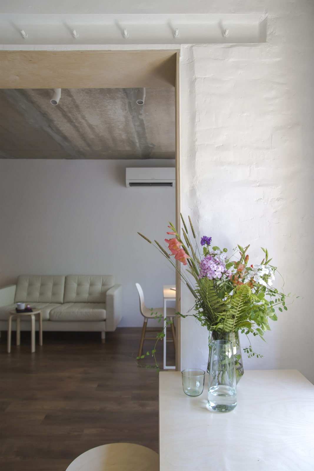 The walls are painted white. The second color used in the interior is a natural wood shade.