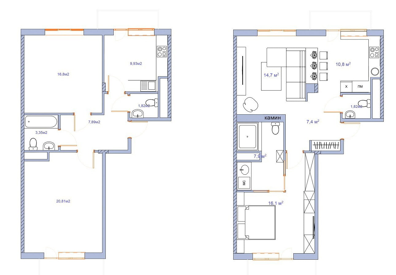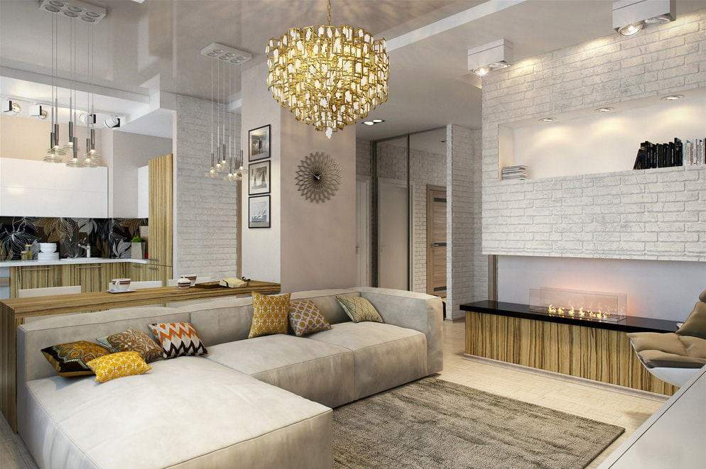 To fulfill all these conditions, the design of the apartment is 58 sq. m. combined the kitchen and living room - a large space was formed that can be filled with various functions.