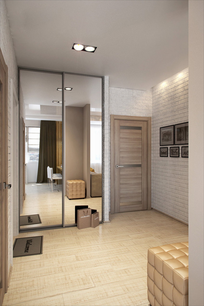 The hallway area also turned out to be open, the light from the windows reaching the front door. Small in area, it began to look much wider and, most importantly, light due to the use of mirrors as facades of the storage system.