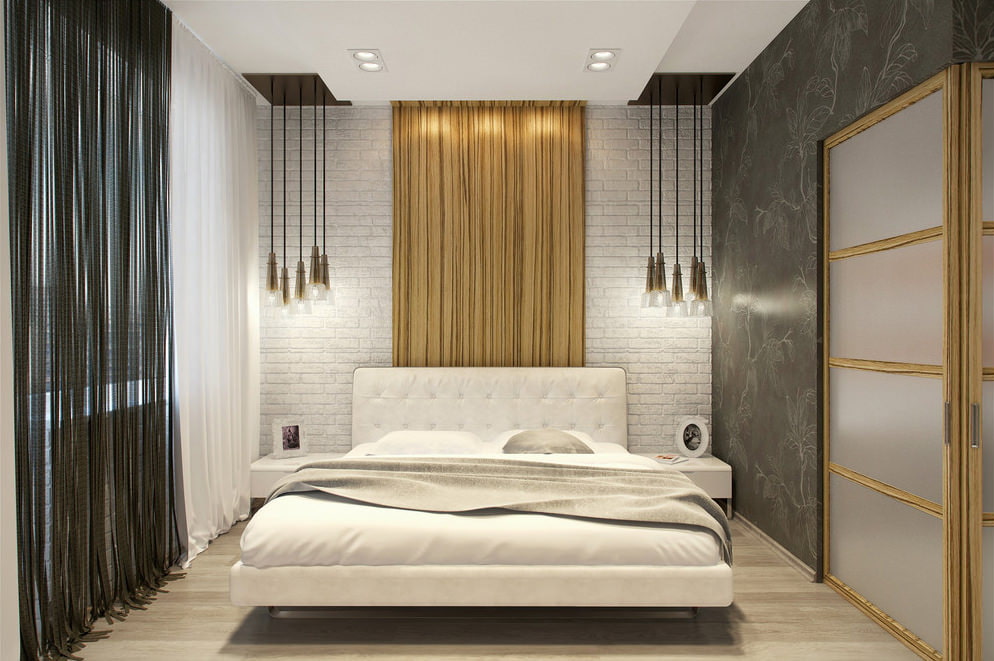 In a small area, you should not use too many different finishing solutions, and in the design of an apartment of 58 sq. There are only three of them: a brick wall in the living room, zebrano veneer and light-colored parquet boards on the floor.