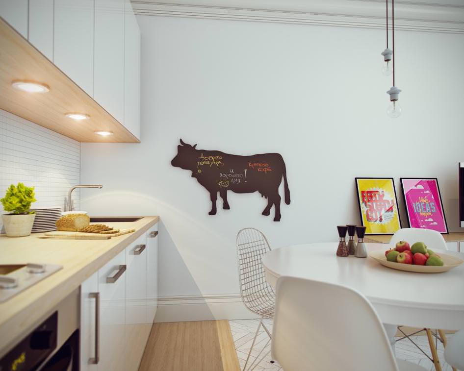 The entire interior of a small apartment in the Scandinavian style is very strict: white walls, a white ceiling of the same shade, as a decorative detail - a cornice along the entire ceiling, also painted white.