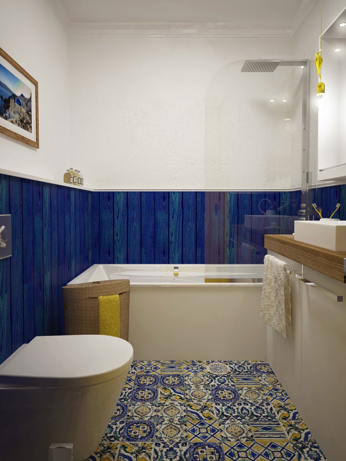 The bathroom is decorated very brightly and decoratively: patterned tiles on the floor, painted blue and treated with a special composition to give moisture resistance to the lining up to half the height, white walls to the ceiling and a bright yellow door make the room joyful and sunny.