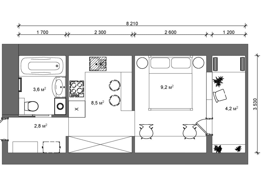 The lounge area on the balcony has a small sofa with drawers, which will accommodate a lot of everything you need on the farm, as well as an open rack. To prevent the interior of the apartment from looking like a pile of furniture, the designers abandoned the upper row of kitchen cabinets, replacing them with open white shelves, almost invisible against the background of the wall.