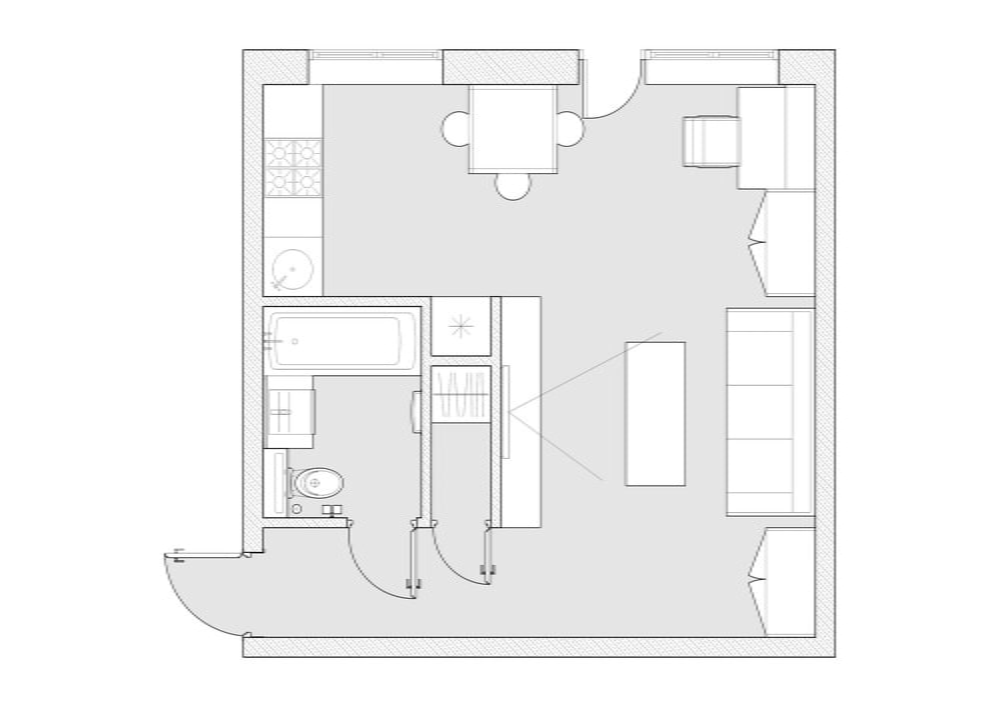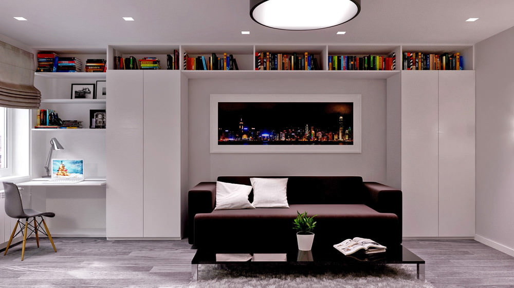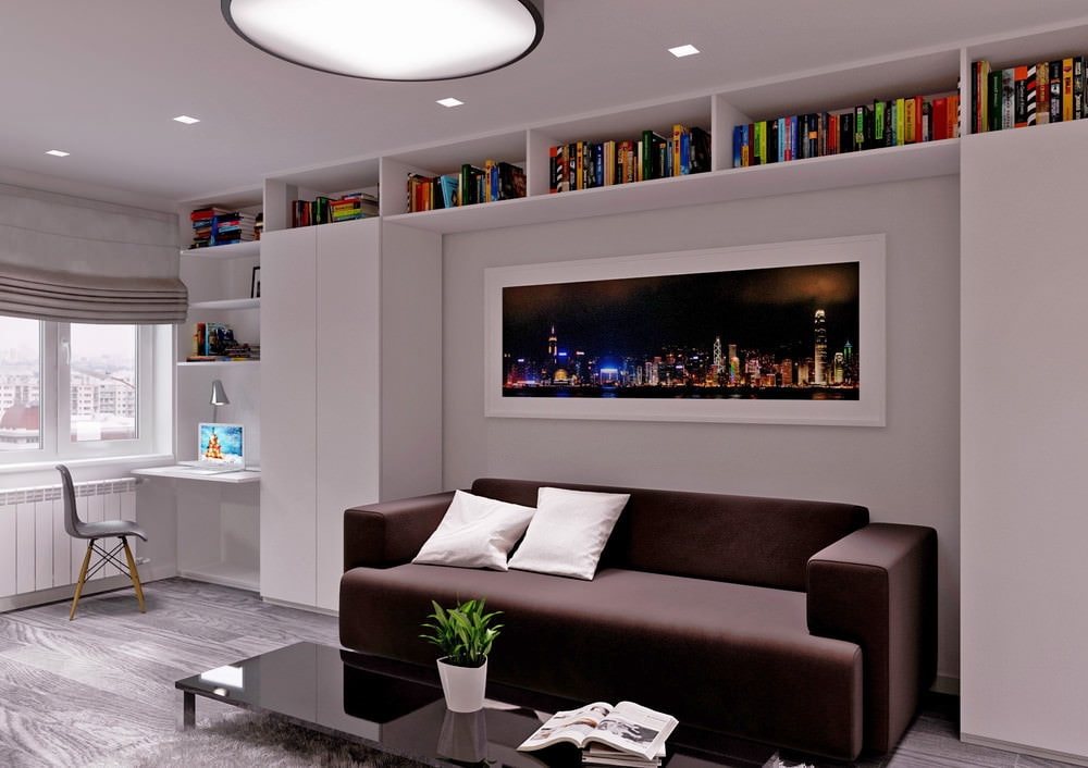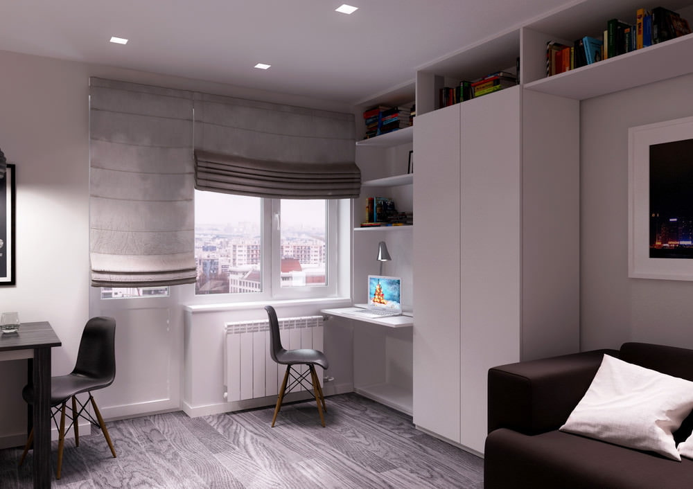 There is a workplace near the window of the living area, the tabletop of which is fixed to the wall and wardrobe. Roman blinds make it possible to regulate the amount of light during the day. Built-in ceiling lights and a circular shade are used for evening lighting.