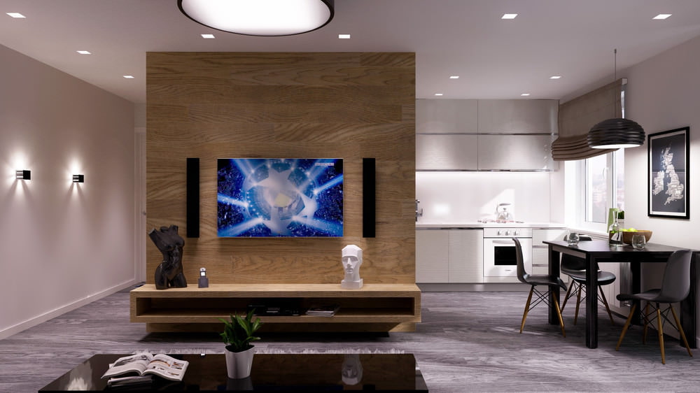 A remarkable component of the interior of a one-room apartment is a cube in wood, which stands out against the white background of the walls and ceiling. Inside it is a bathroom and a hallway closet, and the front side of the cube is the visual center of the room with a protruding shelf for decor and a TV panel with acoustics. Attention is drawn to the unusual decor in the form of a part of a graceful female figure.