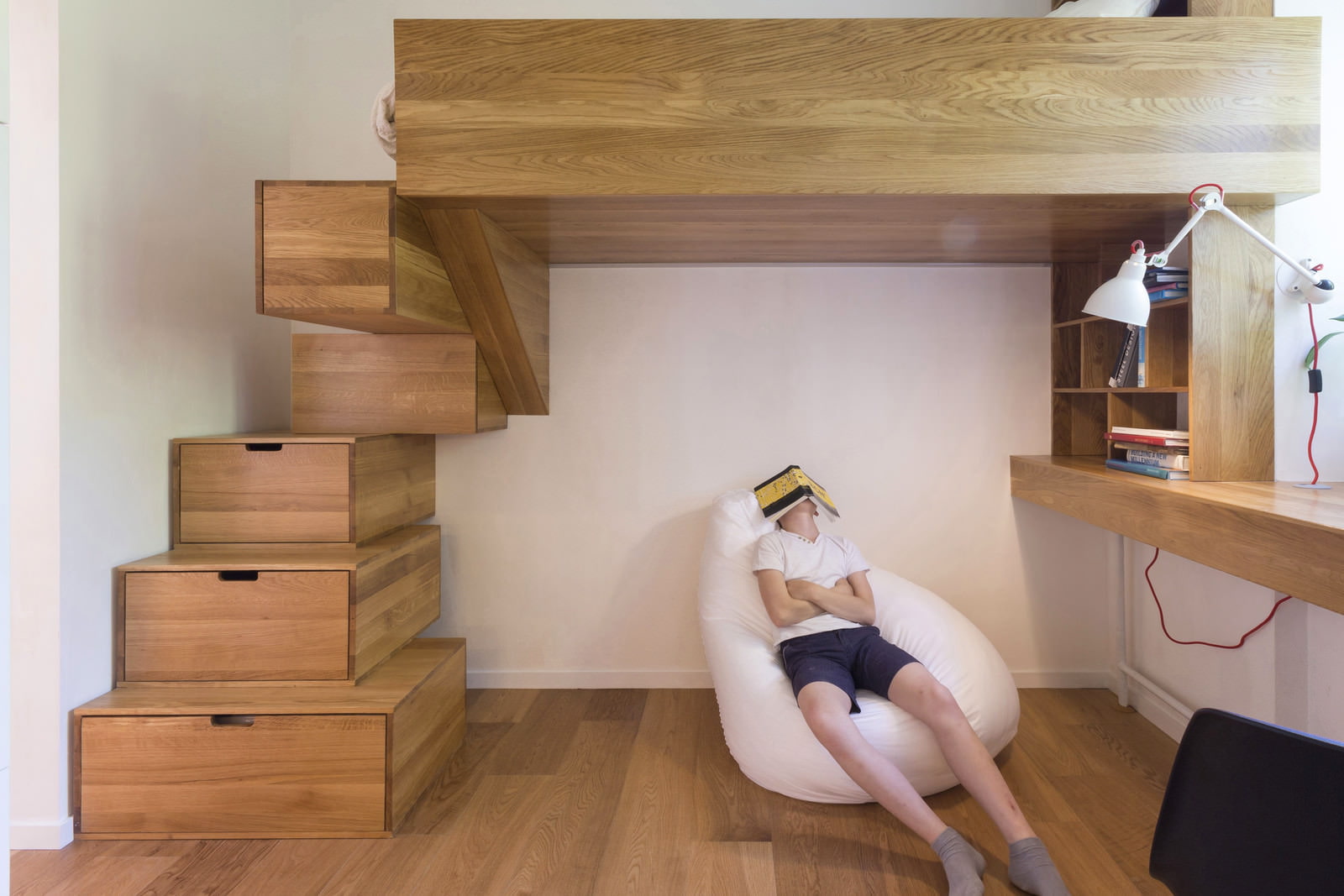 In addition, storage systems made up of separate blocks can also act as stairs. The block divides the room into two equal areas, each of which has a sleeping and working place.