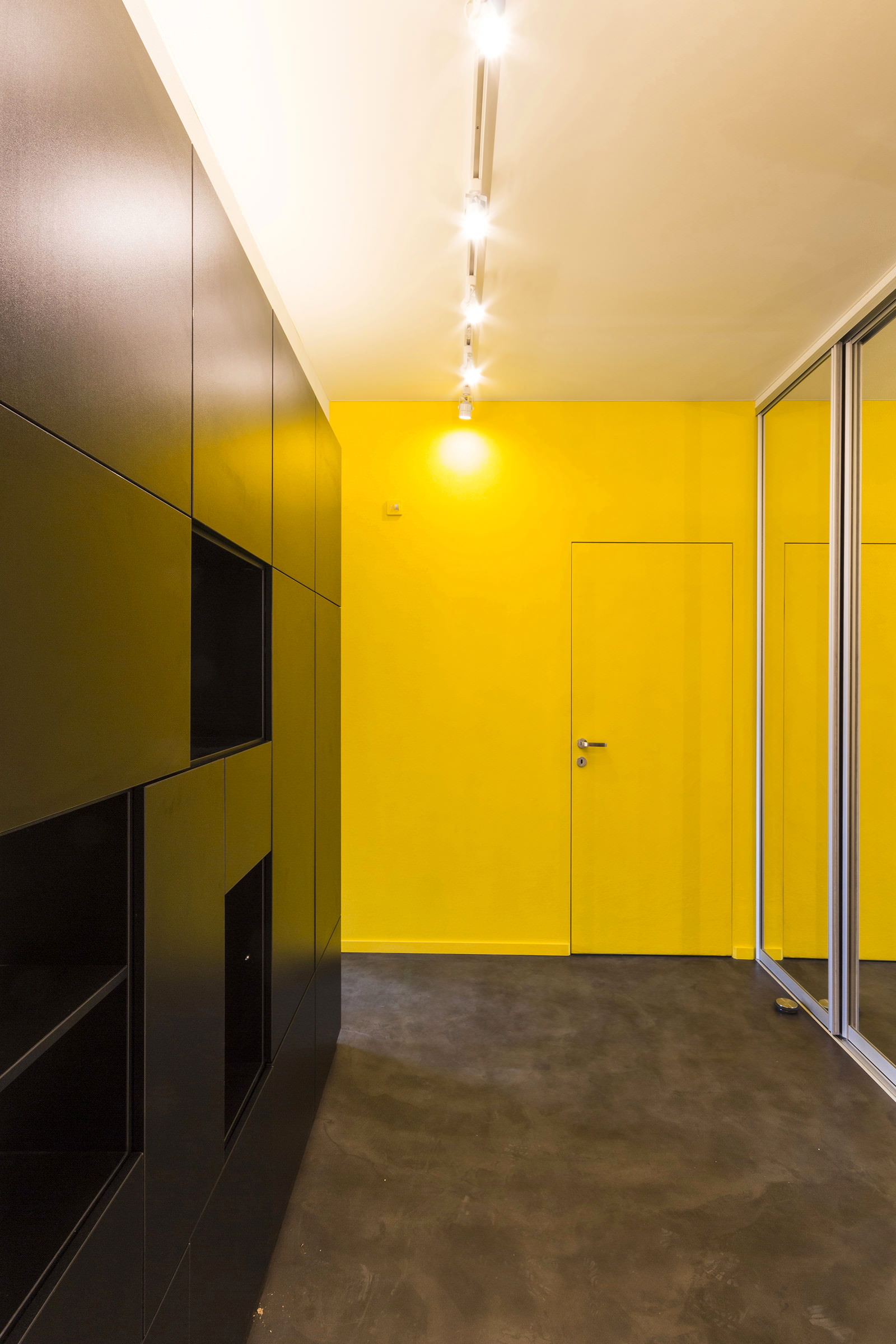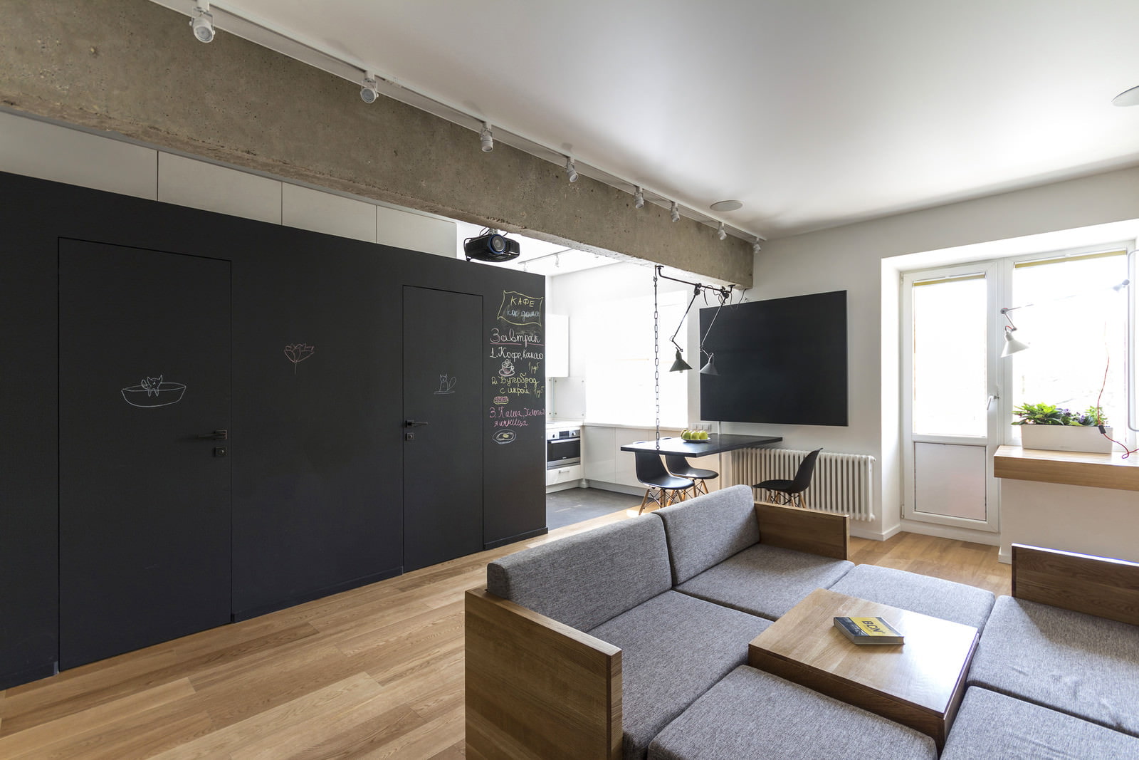 The living room turned out to be really non-standard. The first thing that attracts attention is the black cube on the left side of the entrance. Everything that should not be in plain sight is “hidden” inside it: plumbing rooms, wardrobes for clothes and shoes, and even a refrigerator - it is hidden in a cube on the side that faces the kitchen.