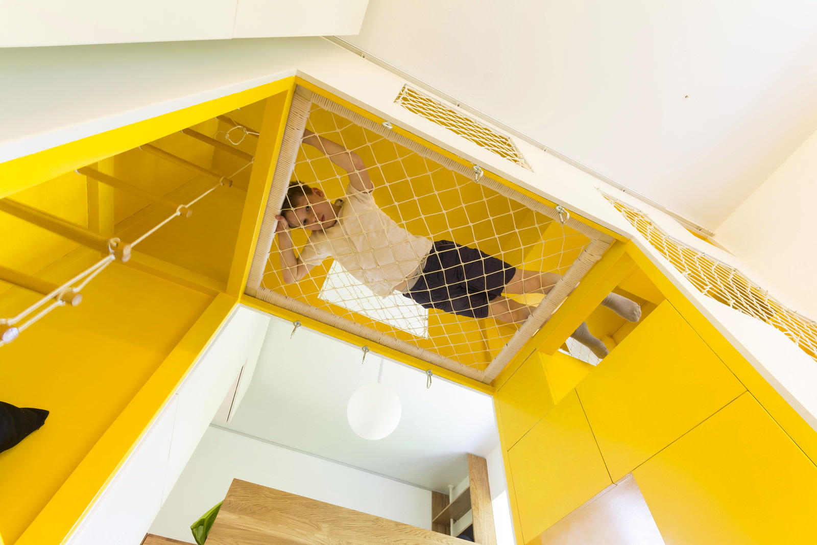 The children's room is 16 sq. m. area, but the Stalinist house gives an advantage: high ceilings. The play block rises to the ceiling and has several levels. There is a hammock, “houses” with windows, hammocks, places to climb to your heart's content and get a charge of sports vigor.