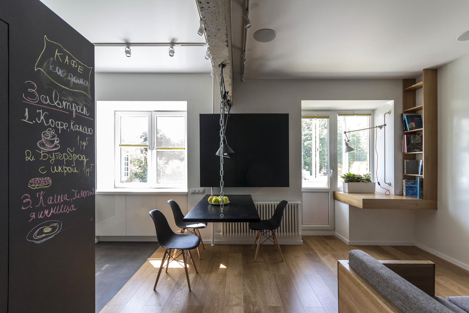 The surface of the cube is not simple - it can be used as a blackboard, draw with chalk, leave inscriptions, which children really like. Children's creativity at the same time serves as an additional decorative accent in the ascetic interior of the living room.