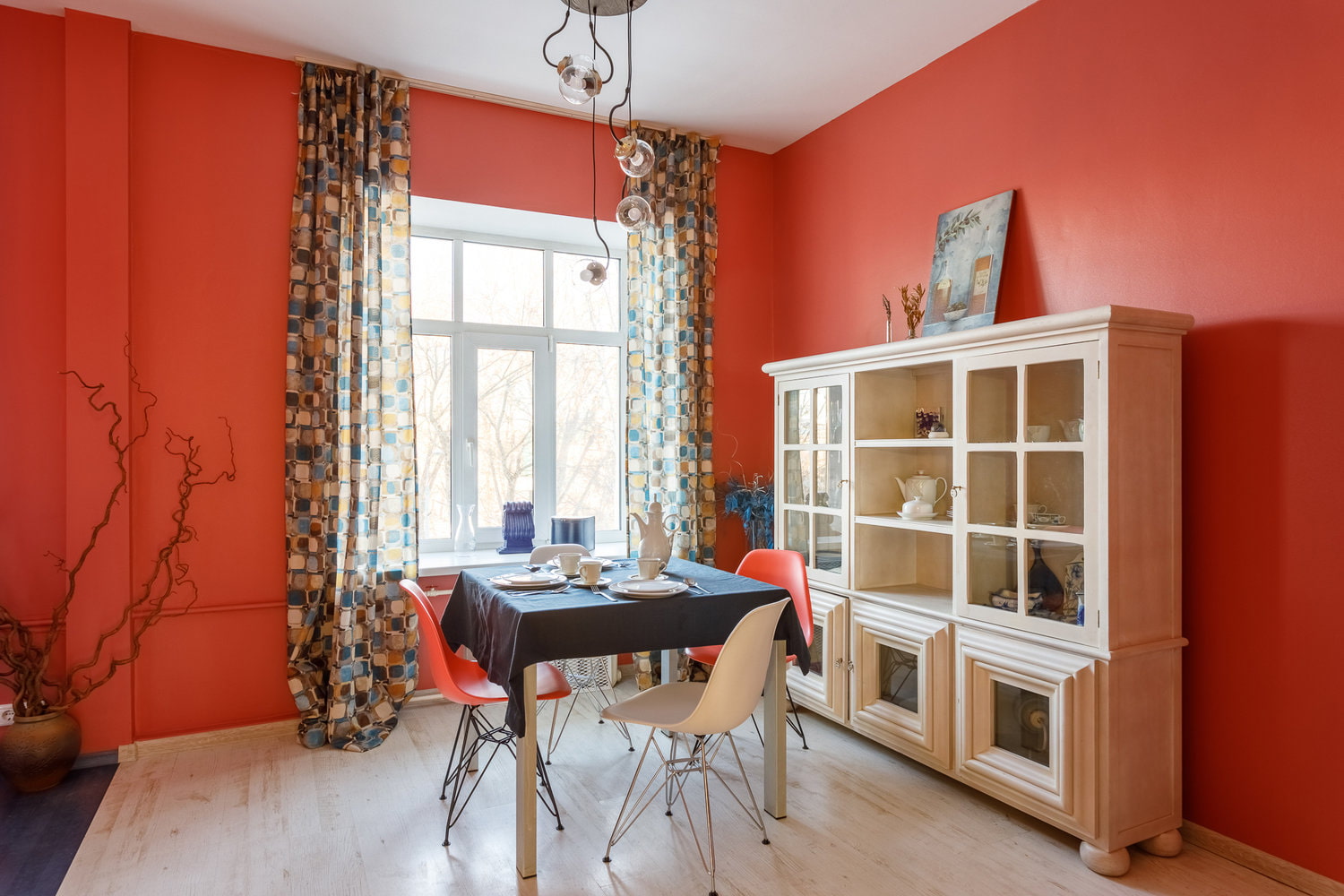 Before the renovation, the walls of the kitchen were painted white, furniture and textiles did not match and did not add up to the overall picture. The room looked more like an operating room, but the designer dealt with this problem by combining elements with complex, rich colors. A complex shade of red gave the atmosphere a character: it began to resemble a classic English interior.