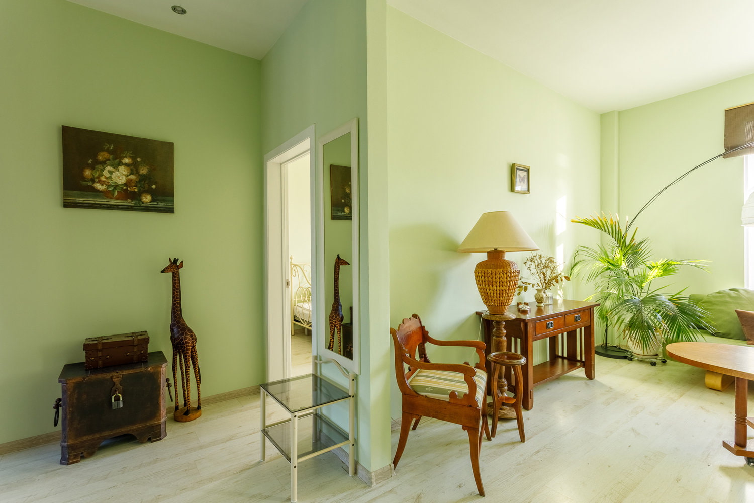 The main bedroom is decorated in Provence style. The shade of the walls is light lime. The decoration of the room is a wrought-iron double sofa bed in Victorian style. A vintage upholstered bench from Italy whimsically harmonizes with a modern wardrobe from IKEA with glossy fronts.