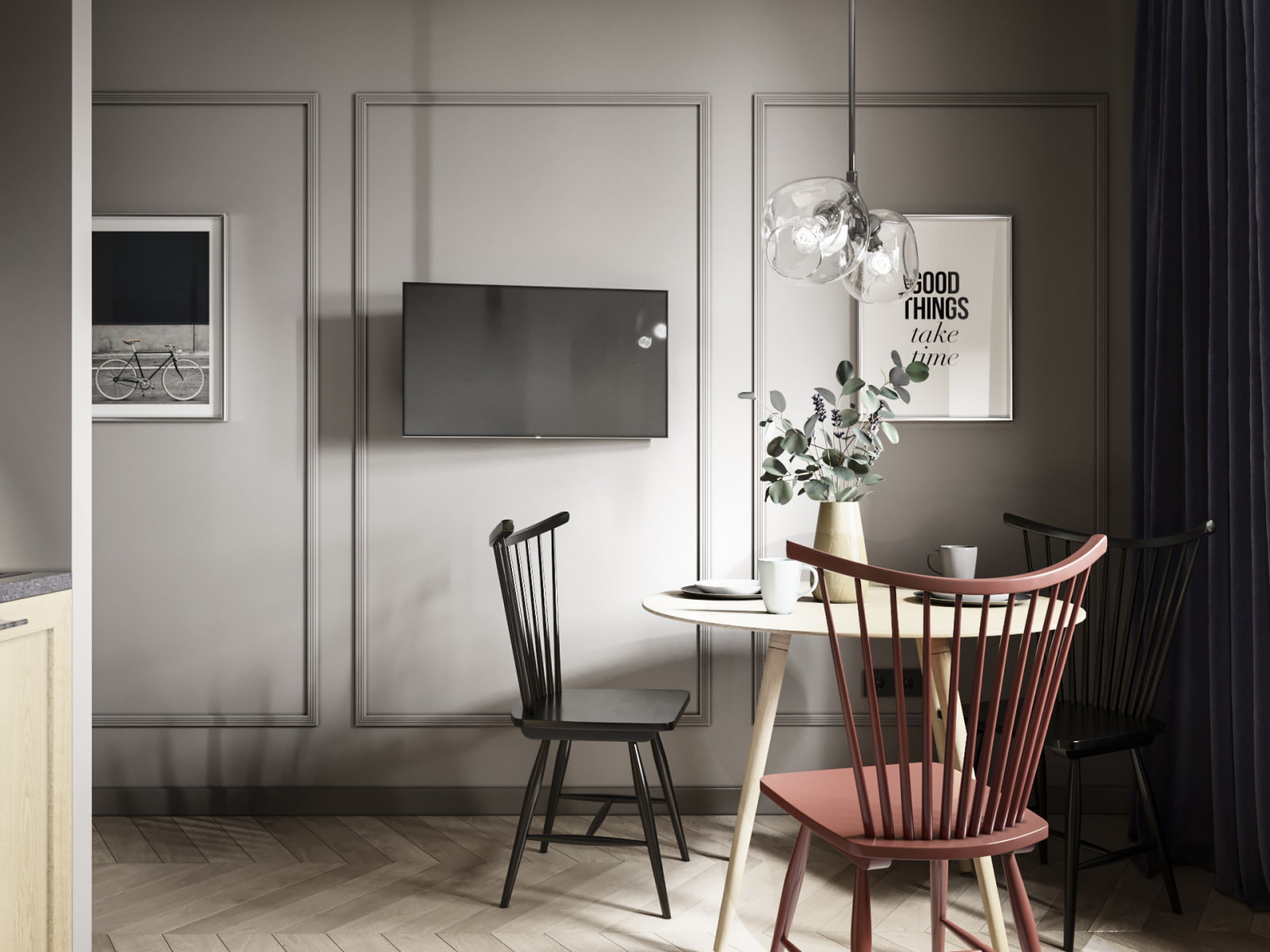 Kitchen walls are adorned with moldings - an easy way to add interesting details to your decor. The set with graphite top cabinets looks laconic, in perfect harmony with black chairs from IKEA and a dark countertop. The wood-textured base units and wardrobe soften the austere design. All household appliances are built-in: this allows you to use a small space as economically as possible. The apron is faced with glazed tiles that reflect light.