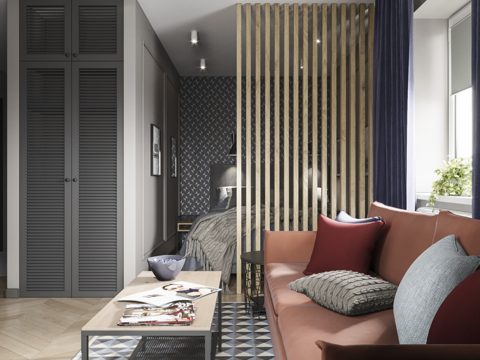 The room is divided into two parts by means of wooden slats: they make the sleeping area more secluded. The headboard is decorated with wallpaper in a cool gray shade with a small print.
