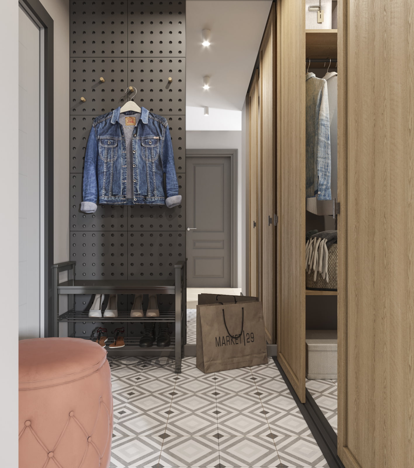 Instead of a hanger, perforated panels are used: the bars play the role of hooks that can be rearranged. Also, the wall is framed with a full-length mirror, slightly increasing the space. A sliding door leads from the corridor to the dressing room. The floor in the entrance area is tiled with wear-resistant porcelain stoneware.