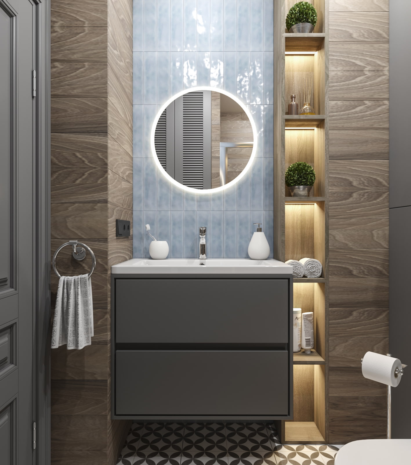 After the redevelopment, the bathroom did not increase much, but this made it possible to arrange the utility block. It housed a washing machine, cleaning products and a container for linen. The space behind the toilet was covered with panels, which, if necessary, open communications. The area above the sink is decorated with glossy tiles laid vertically: this technique visually raises the ceiling.