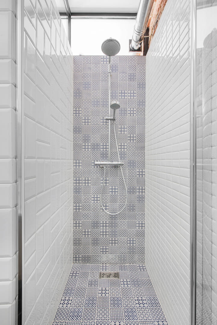 The partitions separating the corridor from the bathrooms are painted dark gray and form a traditional industrial cube. The walls are not lined up to the ceiling: double-glazed windows with thin frames leave the space unified. Natural light enters the rooms through them.