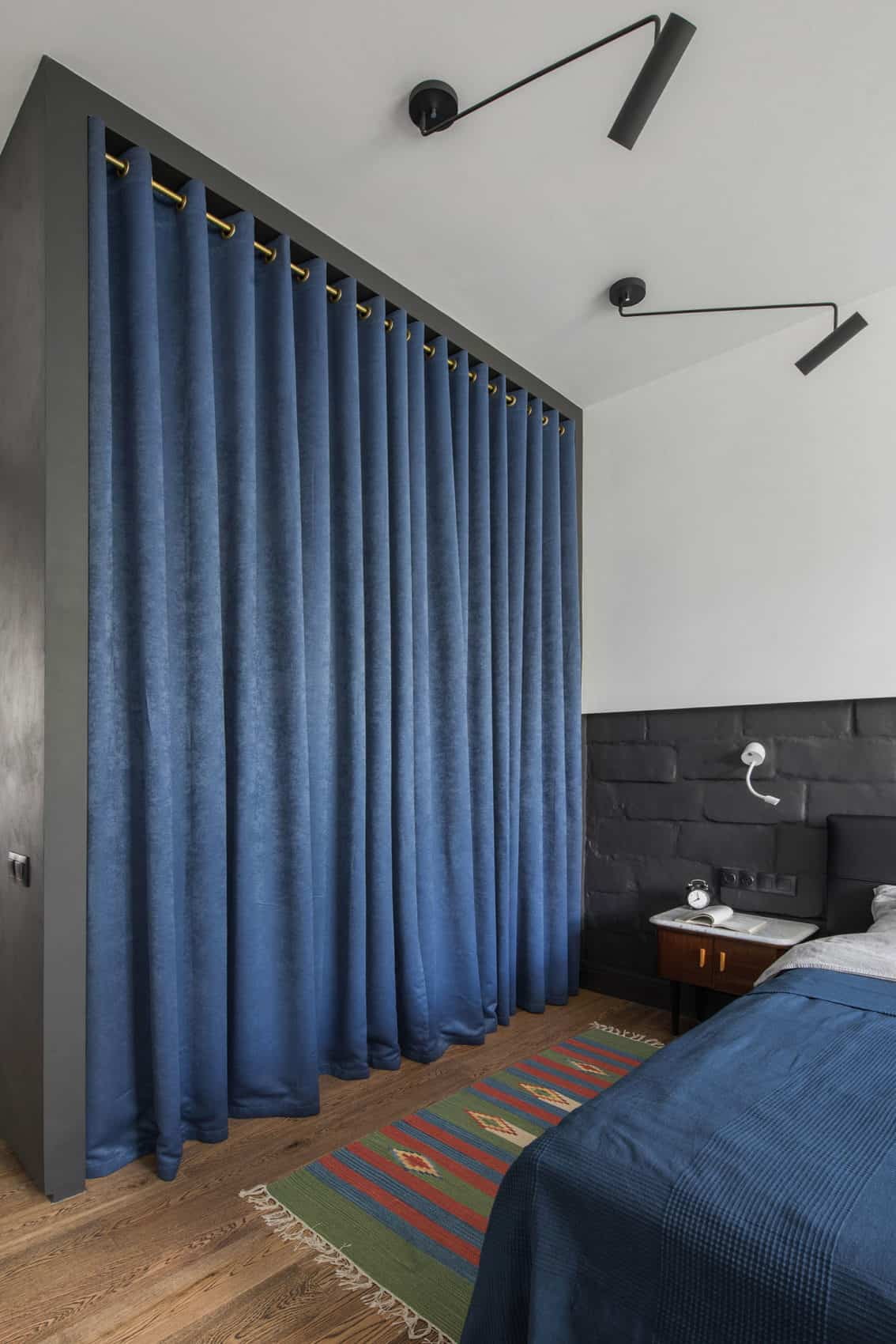 In addition to the bed, there is a storage system in the bedroom: it is located in a niche and is also separated by textiles. The main highlight of the room is an open wall of concrete blocks covered with graphite paint.