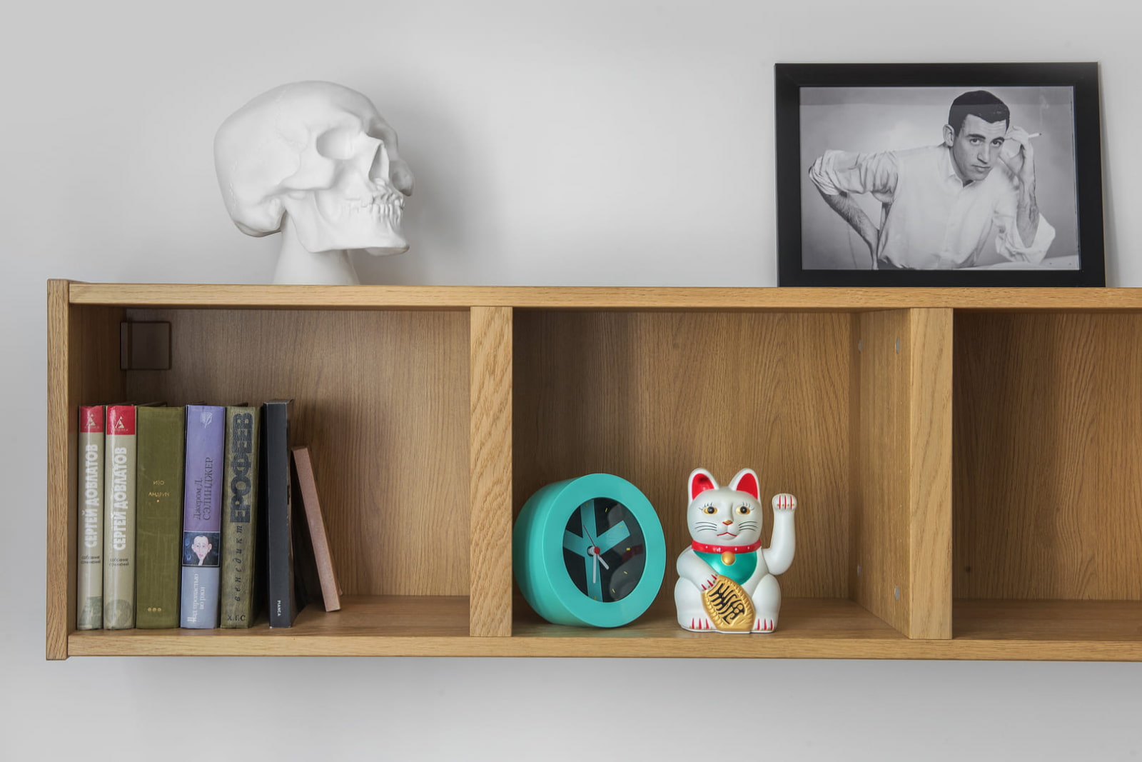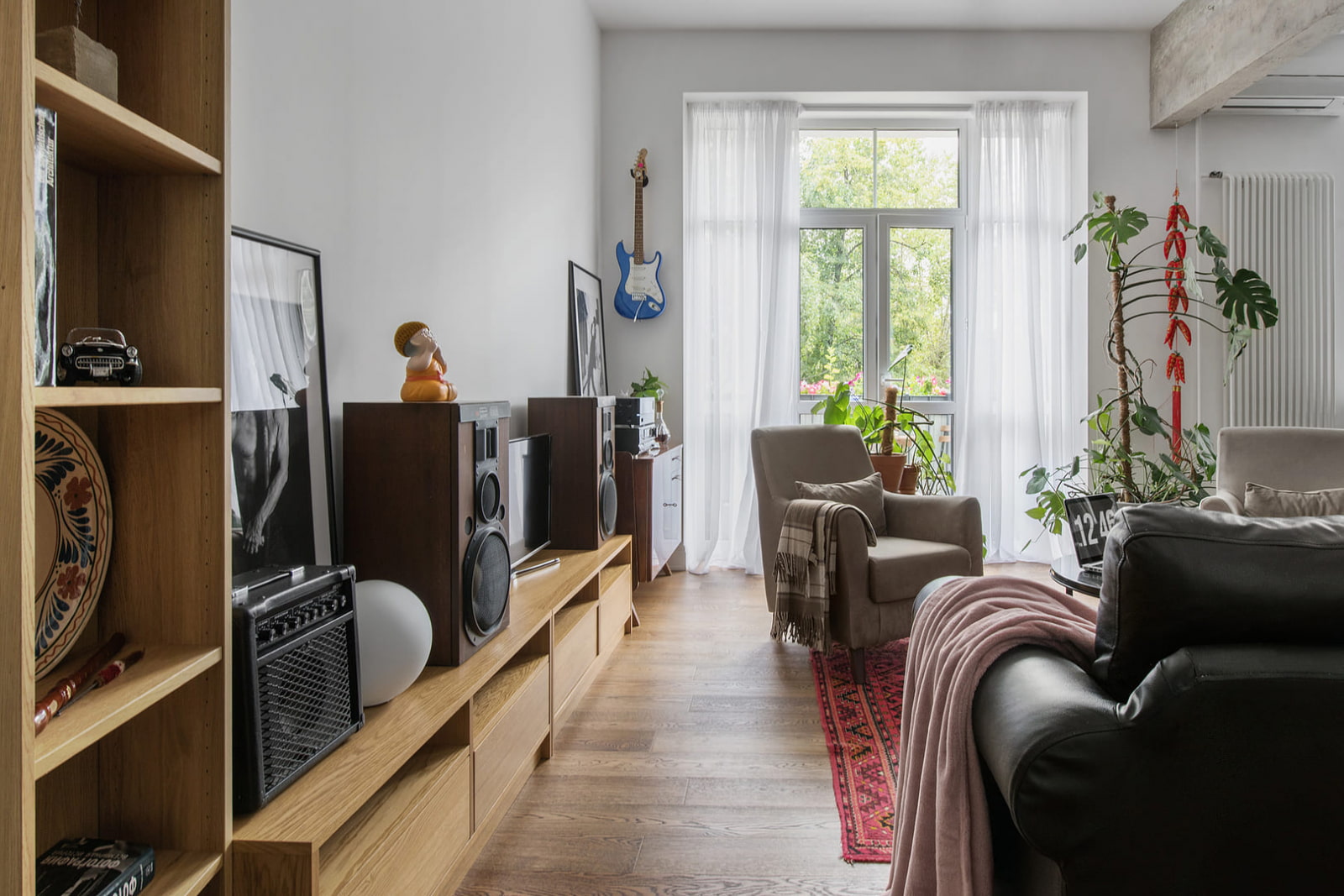 Modern furniture from IKEA perfectly matches the carpet inherited from my grandmother. One of the walls is occupied by a curbstone and a rack with equipment and souvenirs. The coffee table is made of black marble - a luxurious piece that fits perfectly into the surroundings of mass market and antiques.
