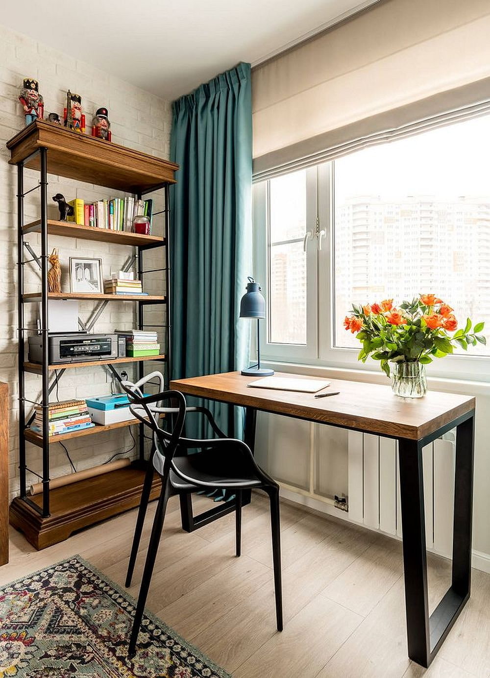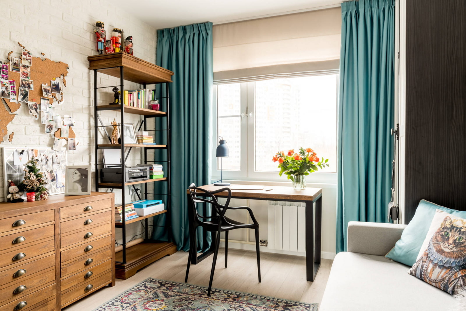 The customer's daughter has already grown out of the pink room. The designer turned the interior into a stylish and functional space for relaxation and study - a white room with turquoise accents and loft elements is much more suitable for a teenager. The partition adjacent to the kitchen is also decorated with plaster clinker tiles - this creates the effect of an authentic brick wall. The workplace is located opposite the window, and the sleeping sofa is placed between two tall wardrobes that create a cozy niche.