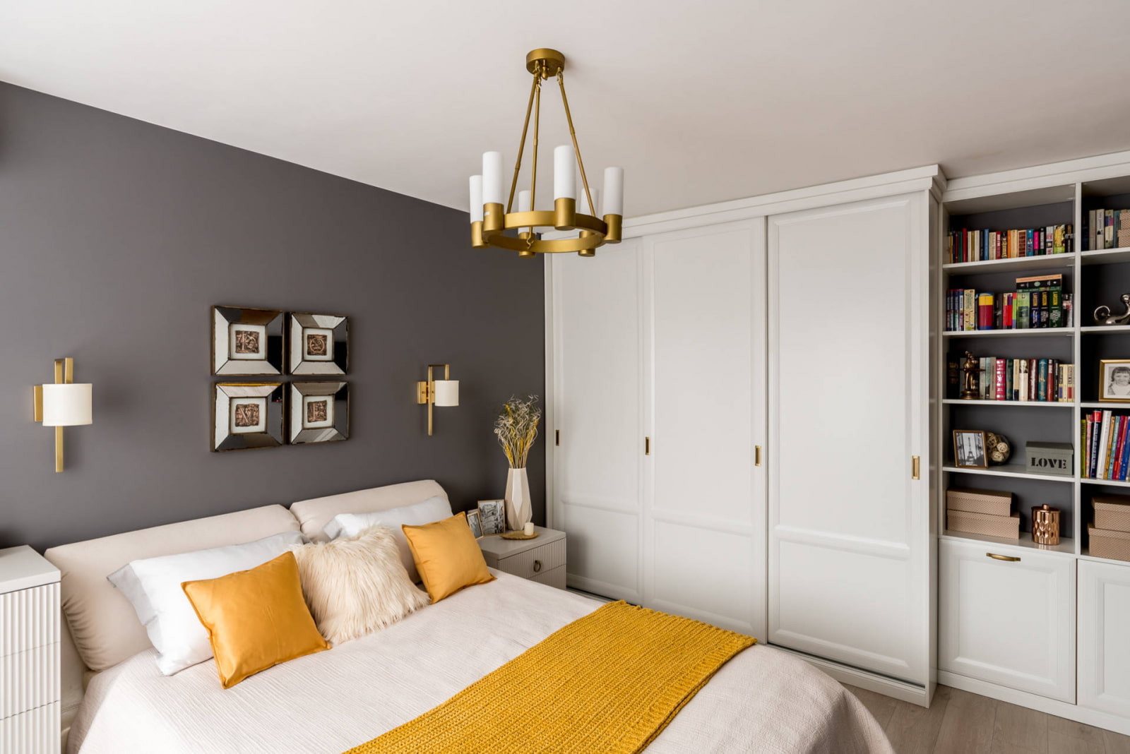 Only the bed remains from the old room in the new interior. The wall at the headboard is painted with dark gray paint: this technique visually adds depth to the room. On the sides of the bed are a custom-made chest of drawers and a sideboard.