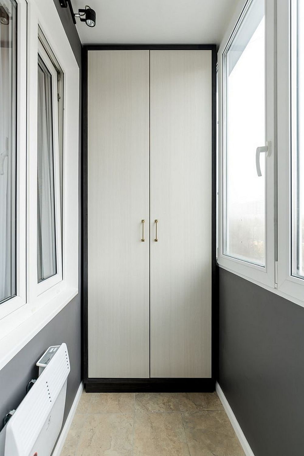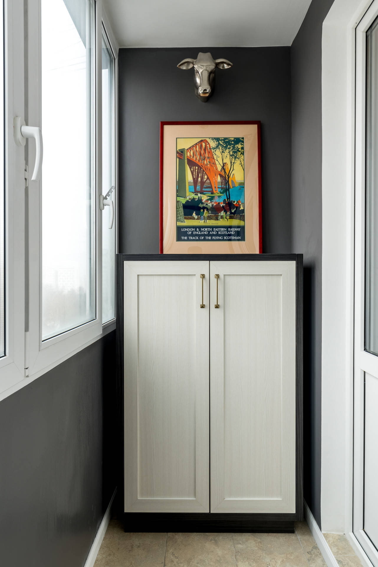 Only cosmetic repairs were made on the loggia: they used the same paint as for the entire apartment, and also installed a high cabinet. A chest of drawers was placed opposite him for storing things. A poster found its place on it, which was supposed to decorate the dining area in the kitchen.