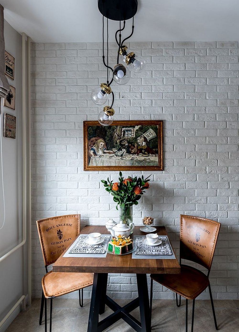 The designer intended to hang a poster over the dining table, but the hostess asked to place an illustration from her favorite fairy tale - "Alice in Wonderland".