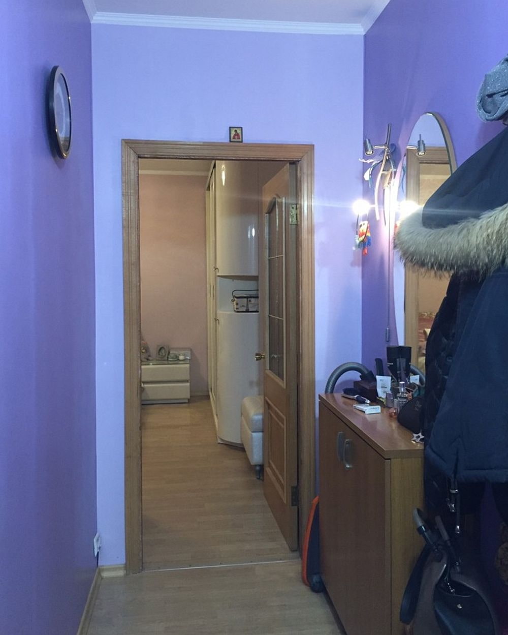 The purple hallway has also changed beyond recognition, becoming white. Its main decoration is art painting in the form of a city landscape, pushing apart the narrow space.