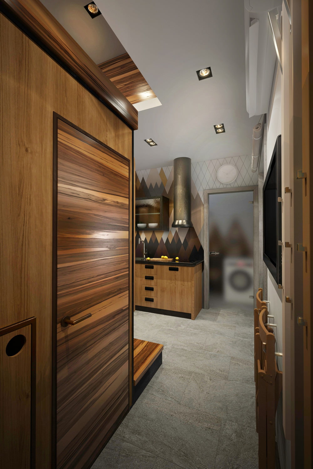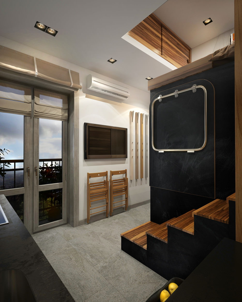 Natural light is provided by doors to the balcony, which offers a magnificent surrounding view. Small apartment of 15 sq. m. turned out to be very stylish and cozy thanks to the texture of wood and natural shades of brown and gray, and the possibility of a simple transformation of the furniture made it possible to save free space.