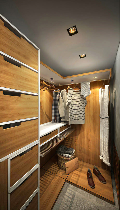 In the dressing room, you can not only place shoes and clothes, but also prepare them for the exit. A wardrobe with drawers allows you to store small things and accessories, and a large mirror can eliminate the imperfections of an outfit.