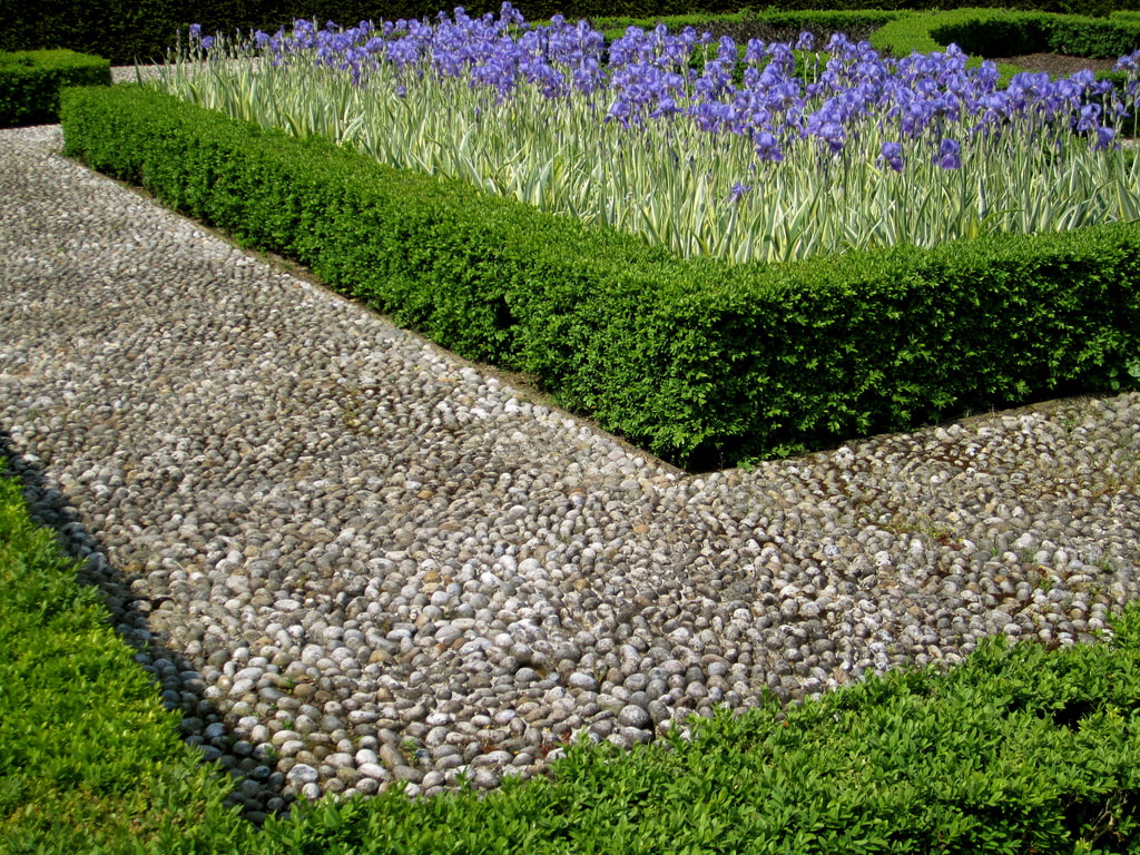 The same rubble or pebbles, plain or multi-colored, can be folded inside the wire frame and design a high curb for a flower bed of any shape.