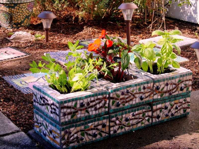 The blocks can be additionally decorated with mosaics. To do this, they are covered with mortar, fragments of tiles or pieces of colored glass are pressed into it and wait for solidification.