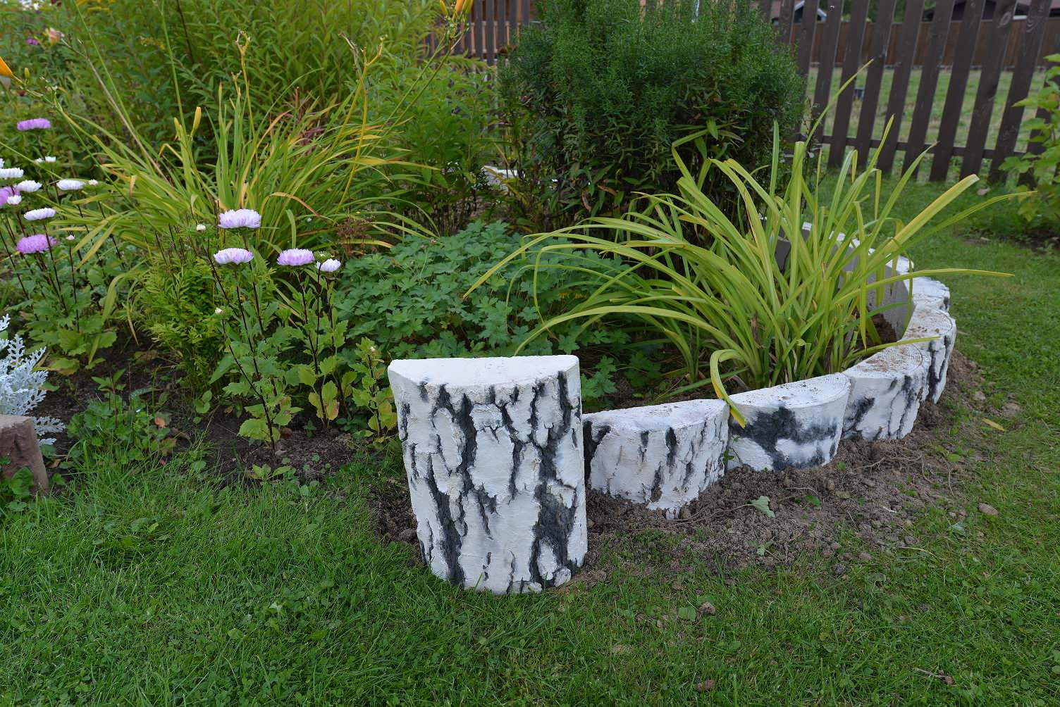 Old logs look very picturesque, laid along the edges of the flower garden entirely. Young birch trunks sawn in two also make a beautiful border for a flower bed.