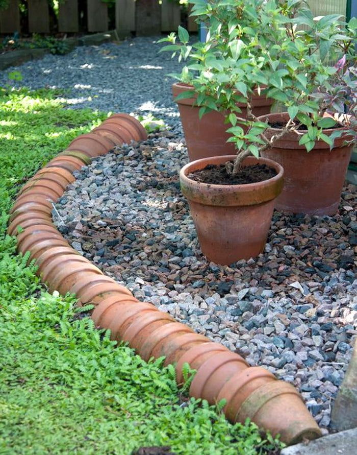 It is quite logical to use old flower pots for the construction of the border, for example, nested in each other. You can cut them into vertical pieces and press them into the soil around the flower bed in one or more rows.