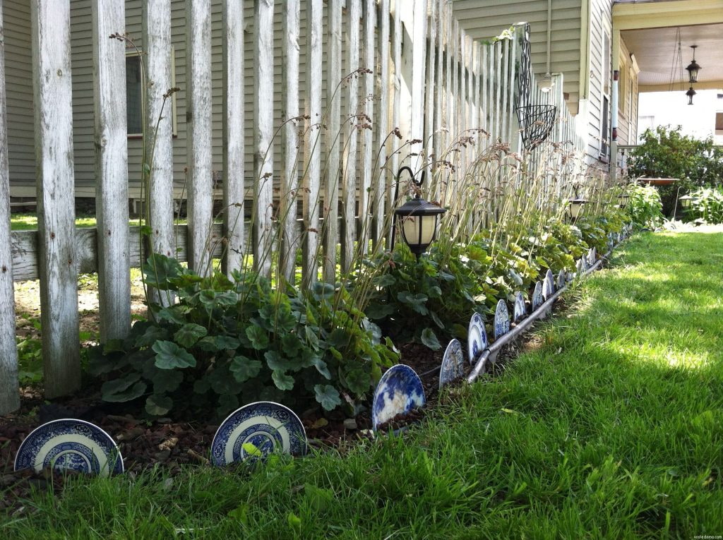 Unnecessary, but cute plates can be dug along the border of the flower garden in a heap or at a short distance from each other. Such a border will look great next to a country estate.