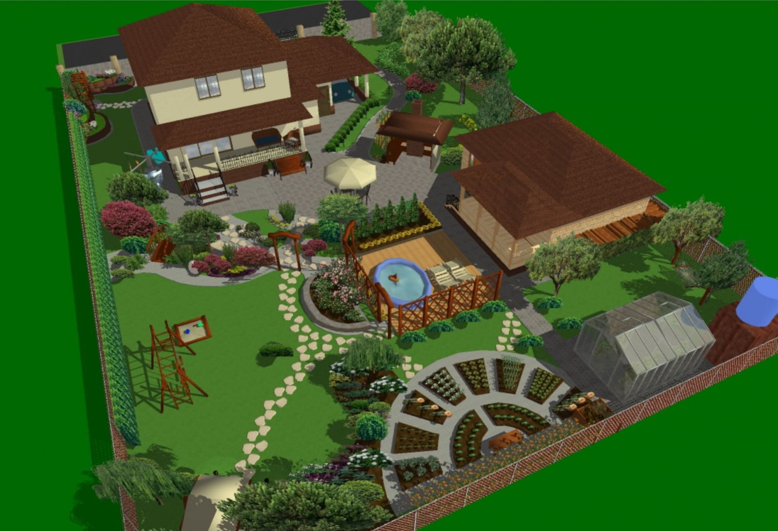 In the photo of the recreation area and garden