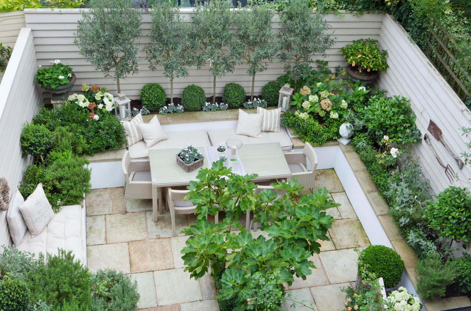 Another trick is perspective. Plant the plants so that they increase in height. The lowest flowers and shrubs are planted near the entrance, tall trees along the fence in the back.